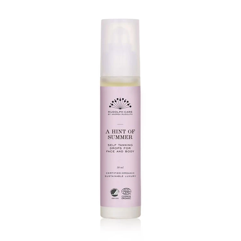 Hello, summerglow! Gå sommeren i møde med den nye økologiske selvbruner fra Rudolph Care. Med små farvegivende dråber forvandles din yndlingscreme til den lækreste selvbruner, og gør det nemt og sikkert at få en smuk, solbrun farve – helt uden sol. A Hint of Summer er en økologisk selvbruner, der giver dig gylden glød, og gør det nemt at opbygge og vedligeholde en solbrun farve i både ansigt og på kroppen – helt uden at udsætte huden for solens skadelige stråler. Fremfor at lave en traditionel selvbruner, har vi komprimeret de farvegivende ingredienser, så du kan blande dem direkte i de hudplejeprodukter, du bedst kan lide at bruge. Dråberne er farveløse og har en let, flydende konsistens og en mild, delikat duft. Det er det naturlige DHA molekyle, der sikrer din hud en fin og jævn tone, og samtidig forkæler de farvegivende dråber din hud med aktive, naturlige ingredienser. Aloe vera beroliger, genopbygger og sikrer hudens fugtbalance, mens acaibærrets høje koncentration af antioxidanter fra essentielle fedtsyrer, vitaminer og mineraler forebygger aldringstegn og virker styrkende på huden.