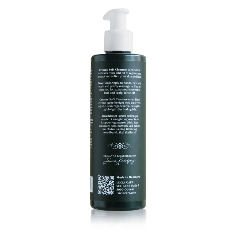 Creamy Soft Cleanser er en blød cremet sæbe beriget med regenererende lægeurter samt aloe vera og solsikkeolie for ekstra nærende og fugtbevarende pleje af hud og hår. Den silkebløde creme skummer op i et blødt og tæt skum og renser nænsomt for snavs og urenheder og efterlader din hud blød og glat. Sæbens fugtbevarende og blødgørende egenskaber modvirker tørhed, forebygger udvikling af kløe samt nedsætter behovet for efterfølgende fugtpleje.