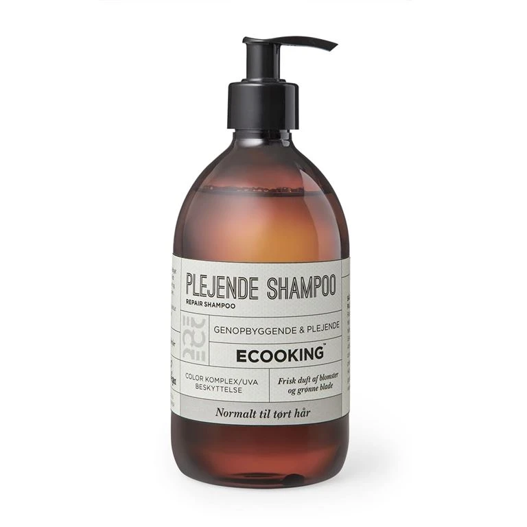 Plejende Shampoo fra Ecooking plejer og genopbygger tørt hår. Den plejende shampoo indeholder et fugtkompleks, som både er fugtgivende og fugtbevarende for hårstrå i op til 72 timer. Indholdet af UVA- og forureningsbeskyttelse, hjælper med at beskytte håret mod hårfarve, sol, vand, luft og anden forurening. Produktet har en frisk duft af grønne blade og blomster.